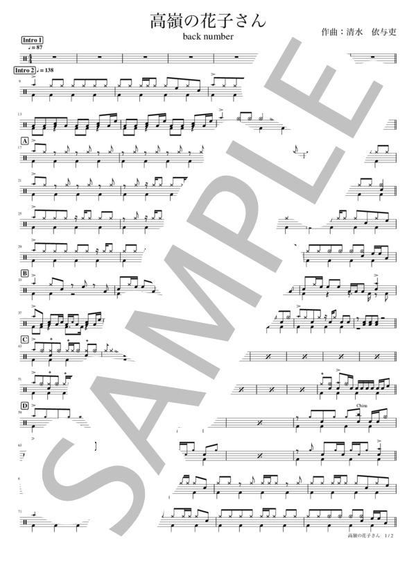 楽譜 高嶺の花子さん Back Number 本当の ほぼ完コピver ドラム譜 バックナンバー ドラム 中 上級 Piascore 楽譜ストア